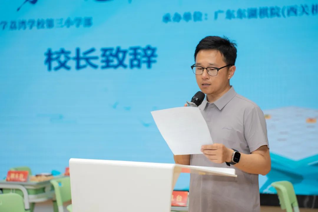 在热烈的开幕仪式中,广东实验中学荔湾学校第三小学部陈校长致辞:“衷心感谢荔湾区各部门对'三棋进校园'项目的高度重视,以及广东东湖棋院(西关棋院)团队长期以来的专业支持。我校将持续深化棋文化推广工作,让更多孩子领略棋类运动的魅力,为传承中华优秀传统文化贡献力量。特别感谢陶汉明特级大师今日亲临指导,也预祝第31届五羊杯全国象棋冠军赛圆满成功!