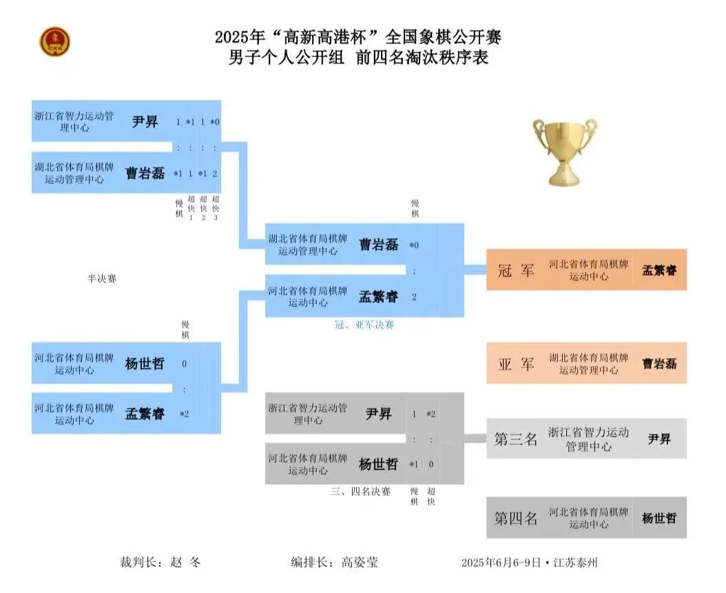在上午进行的男子半决赛中,上半区浙江尹昇和湖北曹岩磊慢棋弈和,加赛至第三盘超快棋,最终曹岩磊更胜一筹,再次晋级决赛;下半区河北杨世哲、孟繁睿分别从1/4区中突围,会师半决赛,孟繁睿在慢棋中先手获胜,晋级决赛。这也是曹岩磊和孟繁睿继2025年“新泰杯”全国象棋公开赛后,再一次在决赛中见面。