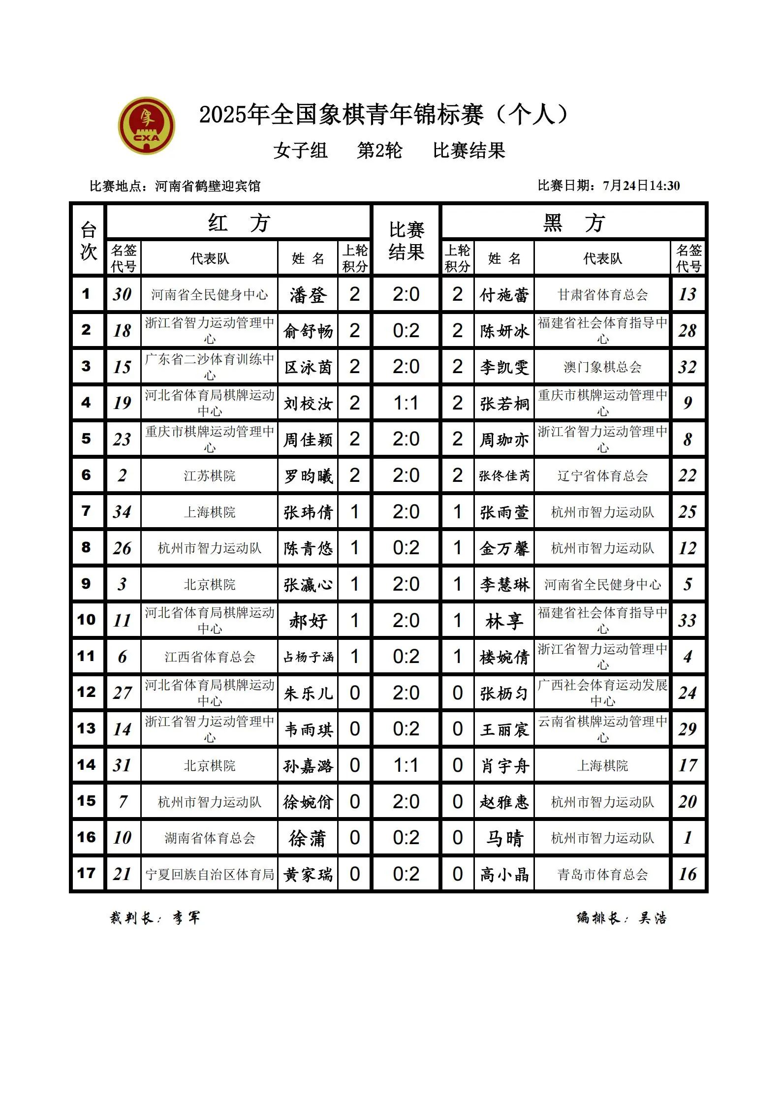在首日进行的比赛中,女子组河南潘登、福建陈妍冰、广东区泳茵3人取得两连胜,男子组上海骆航远、杭州张轩杰、广东廖锦添、成都苏奕霖4人取得三连胜领跑积分榜。全部比赛将于7月27日结束。