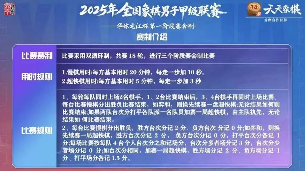 本赛季象甲正赛采用双循环制,共赛18轮,其中“华体龙江杯”第一阶段赛会制将比赛5轮。本届象甲联赛,组委会对参赛资格和竞赛办法进行了改革,各队每轮同时上场2名运动员,第一和第二台比赛结束后,第三和第四台棋手再同时上场比赛。两队如打平,则分别派出一名运动员进行超快棋加赛,决定本队该轮次的胜负。第二轮比赛将于明日(8月4日)17:00进行。