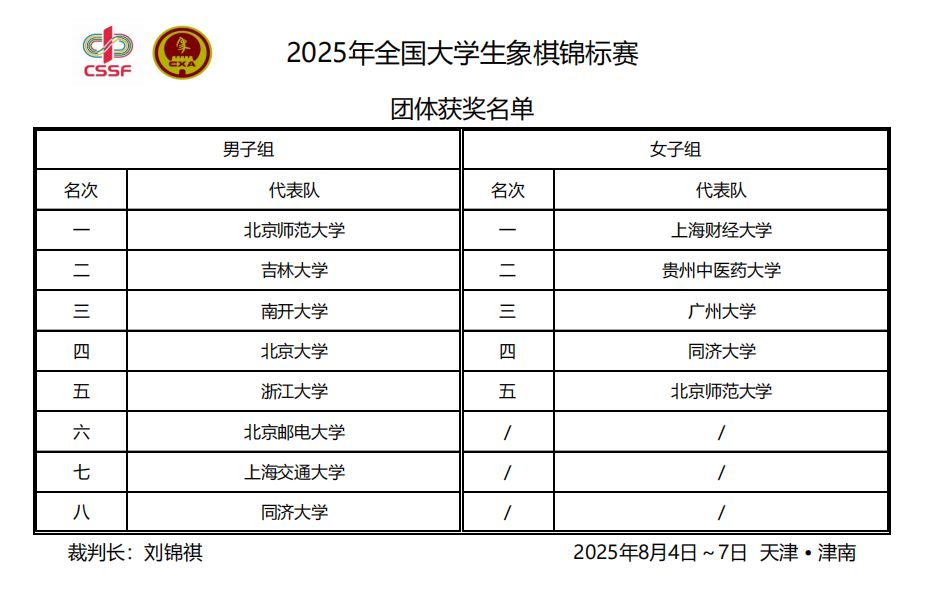 8月7日,2025年全国大学生象棋锦标赛在天津落幕。经过四天的激烈角逐,北京师范大学、吉林大学、南开大学分获男子团体前三名,上海财经大学、贵州中医药大学、广州大学分获女子团体前三名。北京师范大学孙越、复旦大学方晔、吉林大学顾子熠分获男子个人前三名。上海财经大学董毓男、邵如凌冰,上海交通大学李若愚分获女子个人前三名。