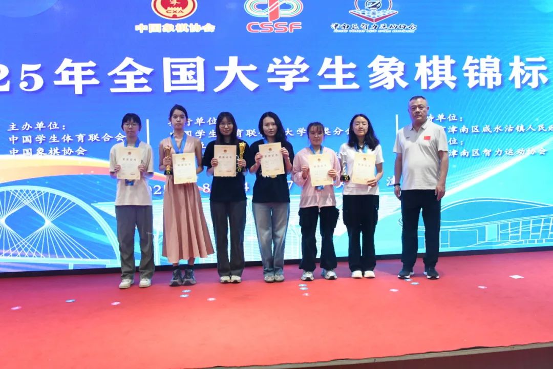 赛后,中国学生体育联合会大学棋类分会主席谢军、天津市体育局副局长吴卫凤、区镇相关领导为获奖运动员颁奖。