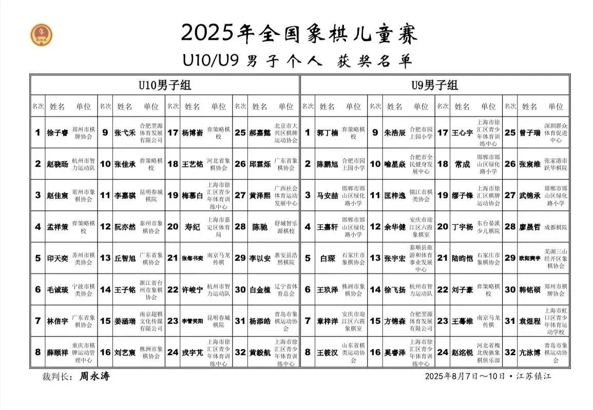 8月10日,2025年全国象棋儿童赛在江苏省镇江市结束了8个组别最后一轮的比赛,落下帷幕。本次比赛共吸引了来自全国29个省(自治区、直辖市)的102支代表队,1066名运动员参赛。