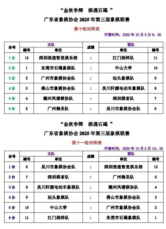 10月5日9:00开始进行最后二轮比赛,棋者象棋平台、广东省象棋协会视频号、广东象棋网视频号继续直播报道(包括棋谱、对阵成绩),敬请关注。