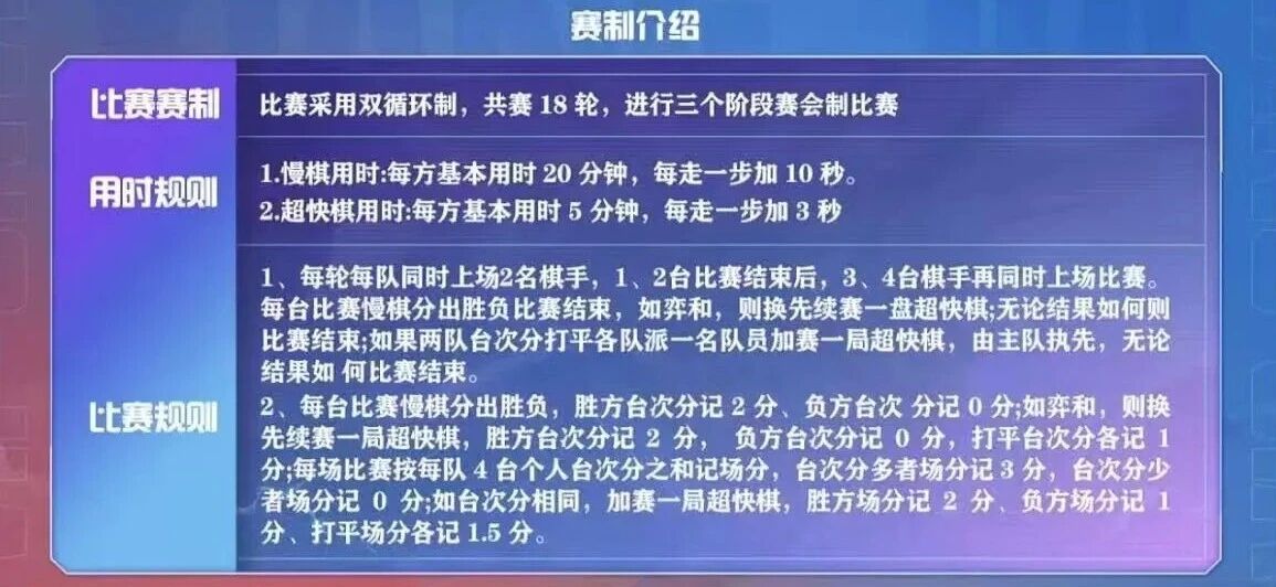 在今日进行的第6轮比赛中,广东省象棋协会队和深圳市群众体育促进中心队在前4盘中战平,加赛中广东莫梓健和深圳宿少峰再次战平,两队各得1.5分。