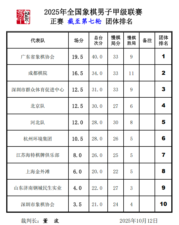 七轮战罢,广东省象棋协会队以6胜1和的不败战绩19.5分位列第一,成都棋院队以16.5分紧随其后,深圳市体育群众促进中心队、北京队则分别以场分12.5分位列三、四名。