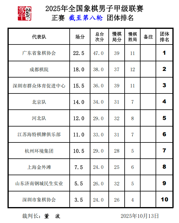 八轮战罢,广东省象棋协会队仍然保持不败领先,成都棋院队紧随其后,第三名深圳市群众体育促进中心队凭借本轮的胜利与第四名北京队拉开差距,江苏海特棋牌俱乐部队凭借本轮胜利排名上升一位,超越杭州环境集团队,位列第六。