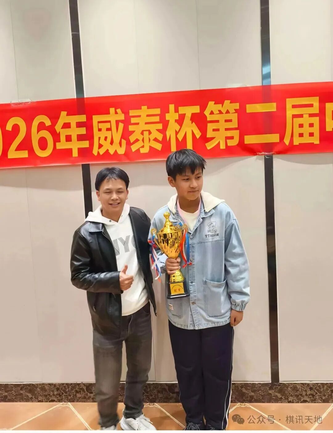 次日,杨浩然乘胜追击,在2026年“威泰杯”第二届象棋公开赛,历经多轮角逐,杨浩然与汕头一流业余高手陈树雄积分相同,最终凭对手分优势夺冠,实现背靠背两连冠。另一小将刘盛强获季军。本次赛事集结66名省内外高手,含1名国家大师及多名省冠。