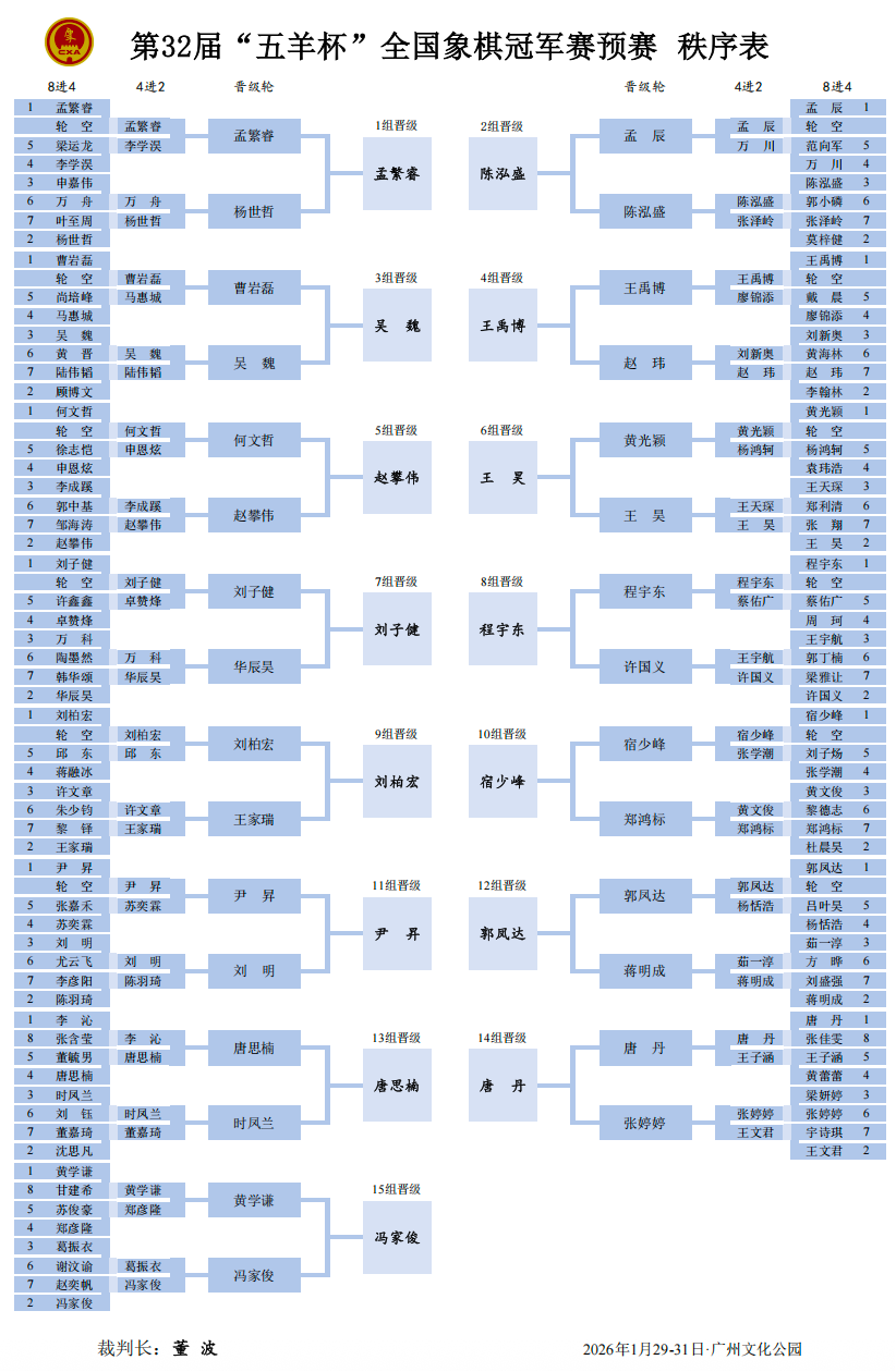 经过3轮单败淘汰赛的激烈角逐,15名棋手从小组赛中成功突围,晋级名单如下: