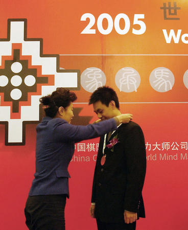 12月15日,国家体育总局局长助理晓敏为获得2005世界象棋大师赛冠军的中国棋手