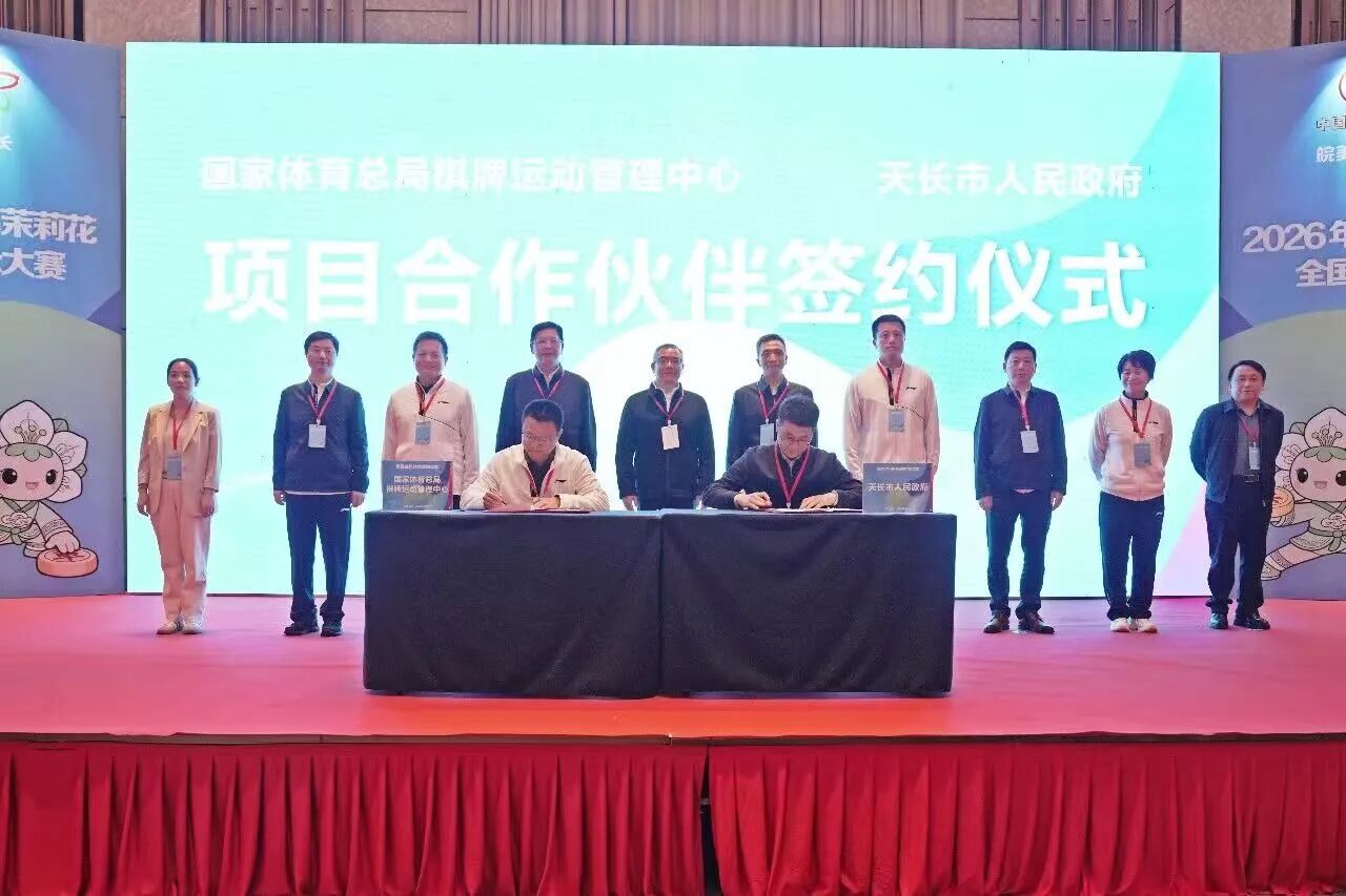 开幕式中,国家体育总局棋牌运动管理中心与天长市人民政府举行了战略合作签约仪式。国家体育总局棋牌运动管理中心培训推广部主任王涛、天长市人民政府副市长何世乐代表双方签署合作协议,标志着双方将以棋为桥,深化合作,以赛为契,共谱新篇,共同推动棋牌运动在天长市的普及与提高,助力天长市“棋艺名城”建设,推动棋牌运动与地域经济的融合发展。