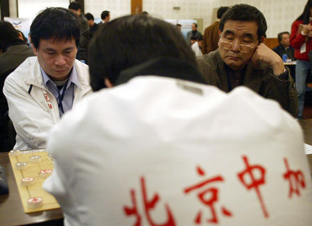 4月9日,特级大师、广东王老吉队主帅吕钦(左)在比赛中与北京中加队靳玉砚战和。当日,2005年全国象棋甲级联赛首轮比赛在北京中国棋院开战。最终,广东队以1胜2和1负战平北京队。新华社记者毕明明摄
