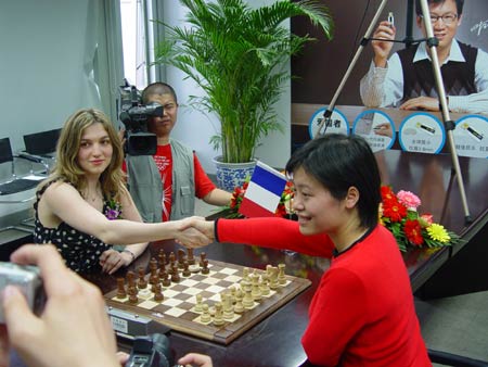 新浪体育讯 4月26日,法籍欧洲国际象棋冠军、女子国际特级大师艾米亚·斯科普里琴科造访华旗资讯北京总部和爱国者国际象棋俱乐部,并在华旗总部会客厅与国际象棋棋后谢军展开一场势均力敌的较量,结果谢军胜出。有意思的是,本次中法棋后对弈的并非传统意义上的国际象棋,而是具有中国特色的爱国者象棋。