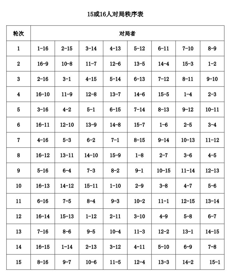 12.1 循环制个人比赛,按照附录二《循环赛对局秩序表》来确定,表上每轮号码列前者执红棋。